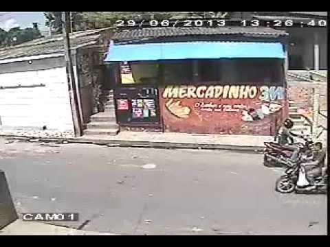 巴西日前發生一名男子闖入一家店搶劫,但卻被附近攝影機拍到,這名盜匪最後被丟出窗外,下場相當尷尬不堪。